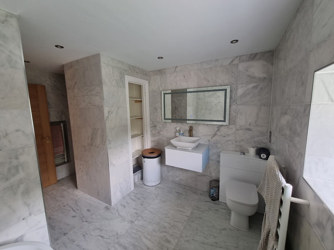 The farmhouse renovation focused on preserving the character and heritage of the building while introducing modern luxury and comfort. With 42-inch thick original walls, the property now features five spacious bedrooms, three of which include en-suite bathrooms. The main family bathroom was finished in floor-to-ceiling marble, complemented by a striking freestanding bath as its centrepiece.
